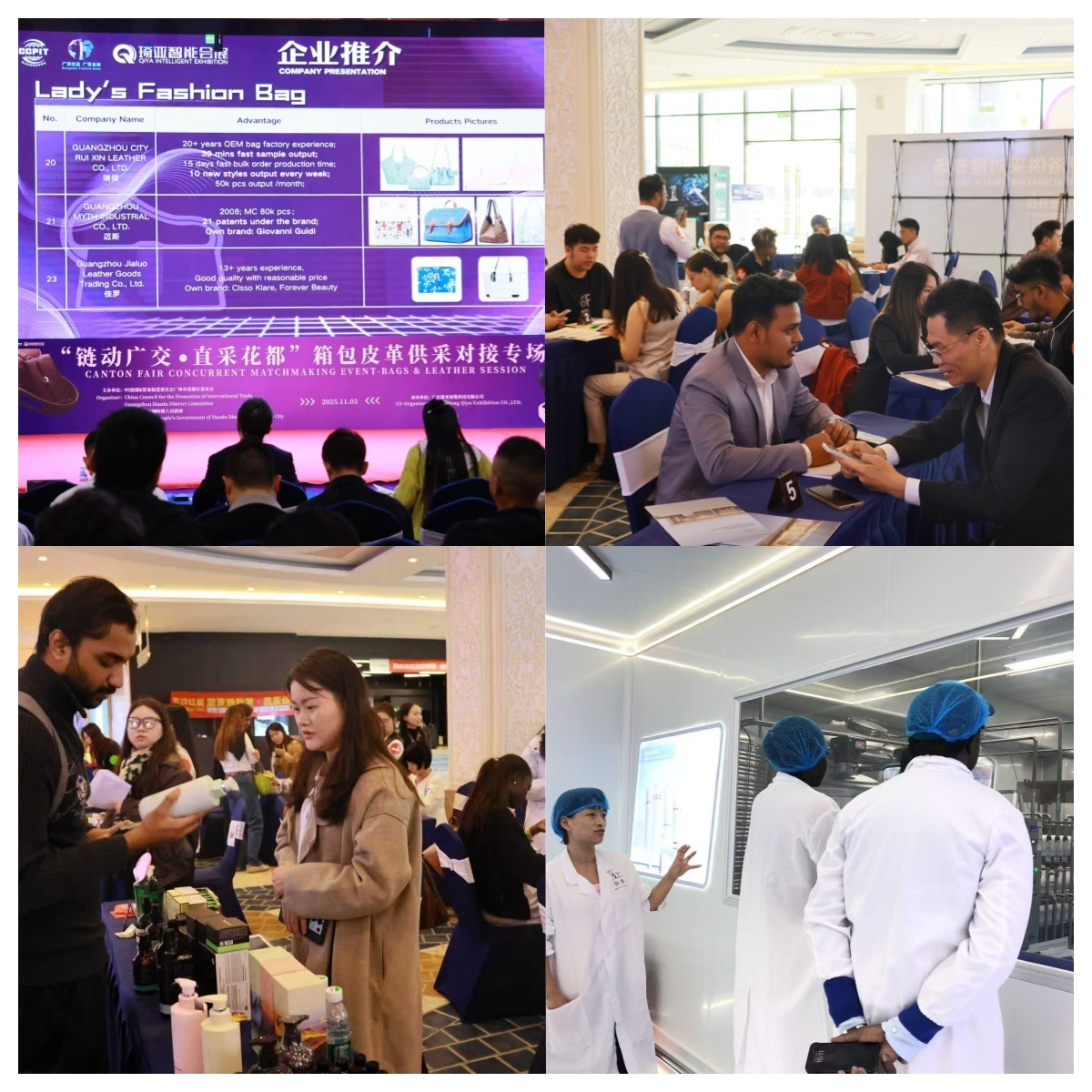 馆外延伸服务,打造“家门口的广交会”。广交会期间,举办广交会“链动广交·直采花都”建材卫浴、箱包皮具、美妆个护对接会,依托广交会采购商资源,聚焦国际采购需求,通过前期深入需求调研与准入筛选,提前梳理企业优势与采购商需求,助力76家花都企业与107家国际采购商精准对接。通过“高效洽谈+实地考察”双轨模式,有效促成本地企业与国际采购商合作,达成意向采购金额5840万美元。