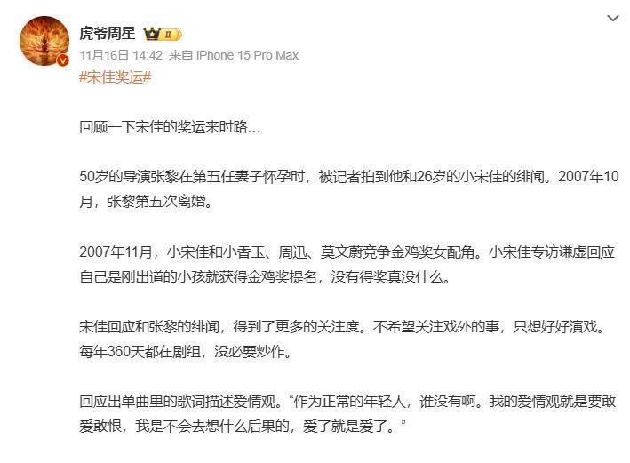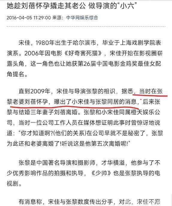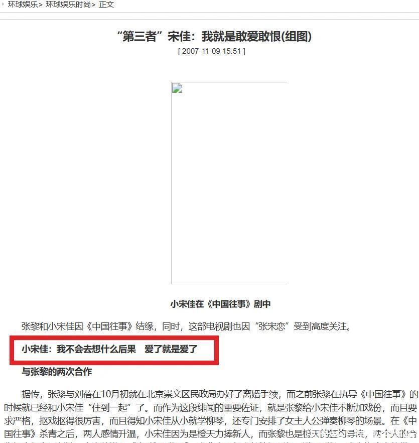 网传当年26岁的宋佳爱上了50岁的导演张黎,那时候张黎还没有离婚,他的妻子还在怀孕中。对于绯闻,宋佳是这样回应的——我的爱情观就是要敢爱敢恨,我是不会去想什么后果的,爱了就是爱了。