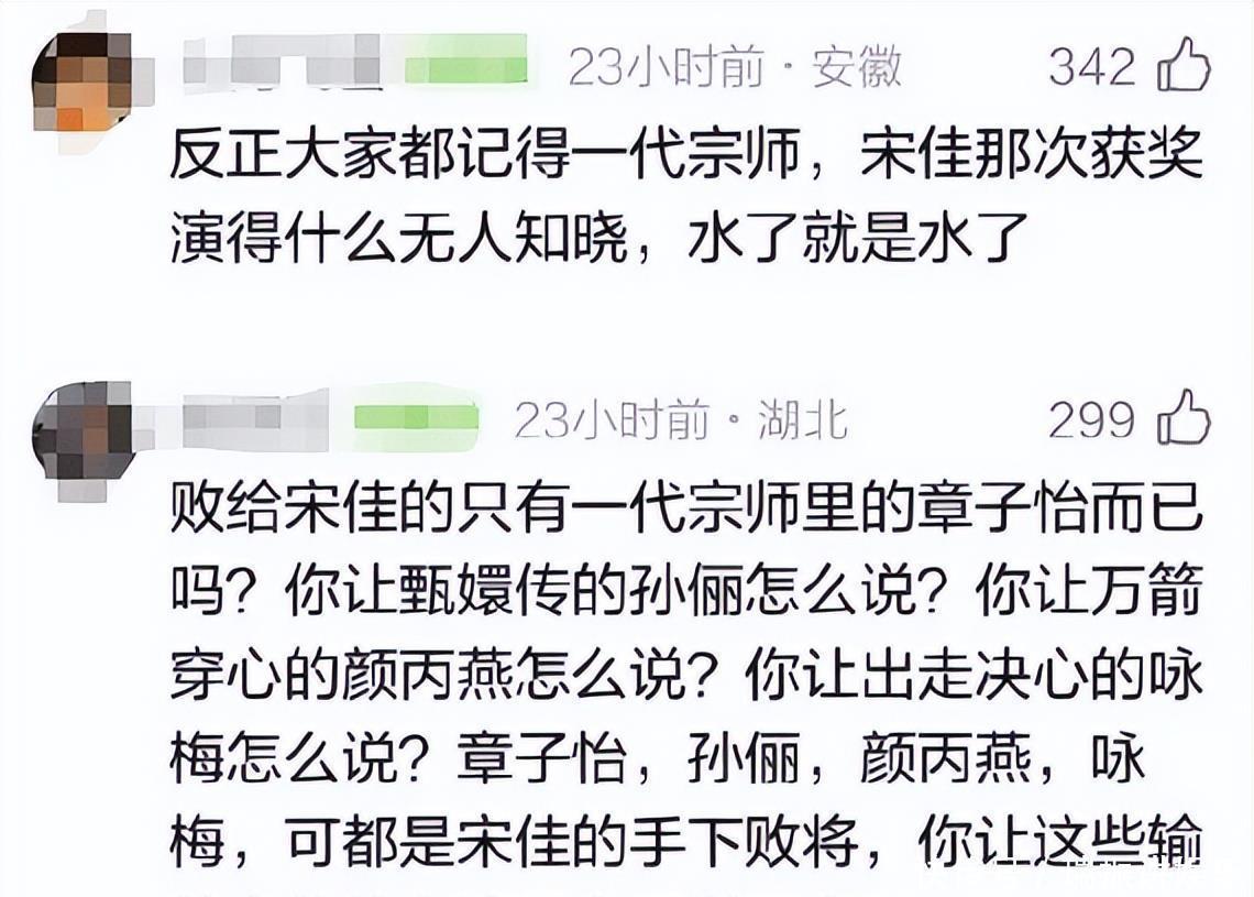 今年金鸡,被网友认为德不配位的人其实不止宋佳,还有钟楚曦和陈思诚,但是因为宋佳往届拿奖就被网友认为“太水”,今年二封金鸡影后,击败了被网友认为表现比宋佳优秀的咏梅,因此被网友集火炮轰了。